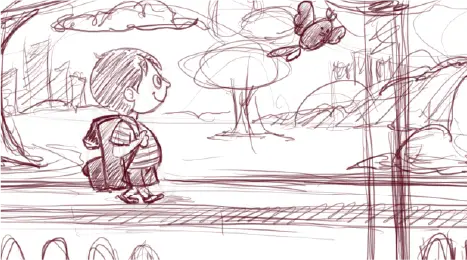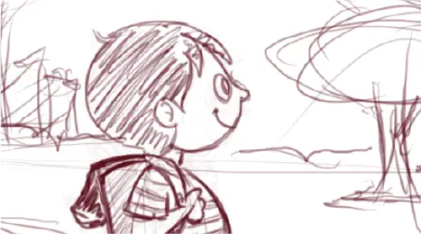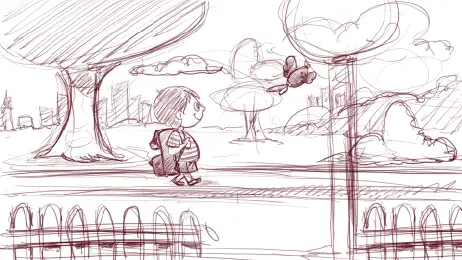 Para que o espectador se sinta à caminho da escola com o Theo, trabalhamos com profundidade de campo. Criamos cenários em múltiplas camadas independentes.